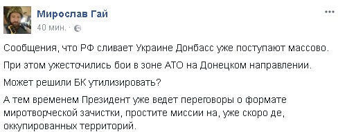 Волонтер, воевавший в зоне проведения АТО, руководитель благотворительного фонда "Мир и Ко" Мирослав Гай отмечает: «Сообщения, что РФ сливает Украине Донбасс уже поступают массово. При этом ужесточились бои в зоне АТО на Донецком направлении. Может, решили БК (боекомплект) утилизировать?»