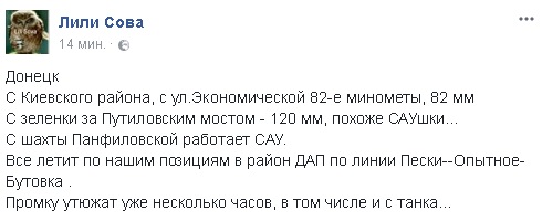 Волонтер Лили Сова подтверждает: «Донецк. С Киевского района, с ул.Экономической 82-е минометы, 82 мм. С зеленки за Путиловским мостом - 120 мм, похоже САУшки... С шахты Панфиловской работает САУ. Всё летит по нашим позициям в район ДАП по линии Пески-Опытное-Бутовка. Промку утюжат уже несколько часов, в том числе и с танка...»
