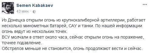 Так, координатор в "СтопТеррор" Семен Кабакаев отмечает: «Из Донецка открыли огонь из крупнокалиберной артиллерии, работает несколько минометных батарей, САУ и танки. По нашей информации огонь ведут из нескольких точек. ВСУ молчали в ответ около часа, сейчас открыли огонь на поражение, точнее подавление. Обстрелов меньше не становится, огонь продолжают вести и сейчас».