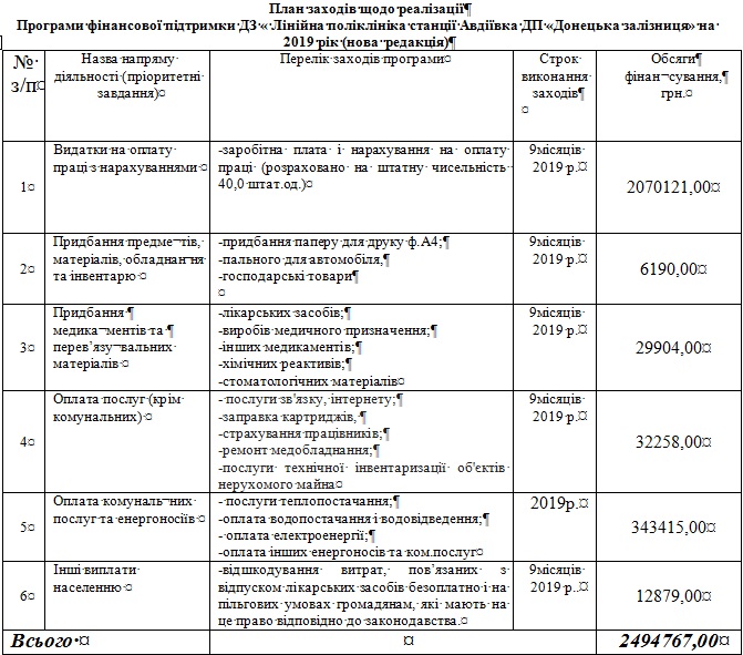 В Авдіївці прийняли рішення про внесення змін до розпорядження керівника військово-цивільної адміністрації міста «Про затвердження Програми фінансової підтримки Державного закладу «Лінійна поліклініка станції Авдіївка ДП «Донецька залізниця» на 2019 рік».