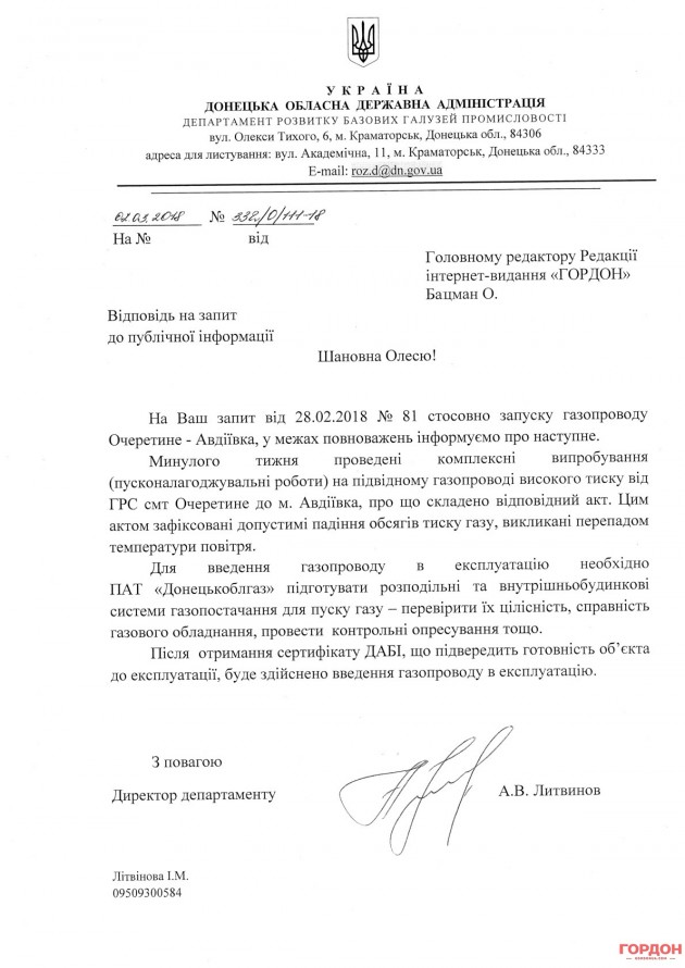 В ответе на запрос издания "ГОРДОН" Литвиненко заявил, что в феврале были проведены комплексные испытания на подводном газопроводе высокого давления от распределительной станции Очеретино к городу Авдеевка. "Зафиксировано допустимое падение объемов давления газа, вызванное перепадом температуры воздуха", – говорится в письме.