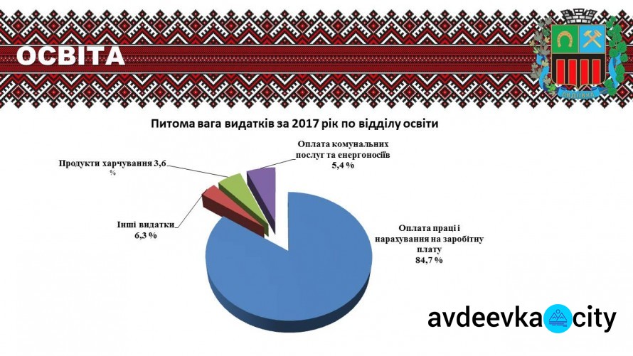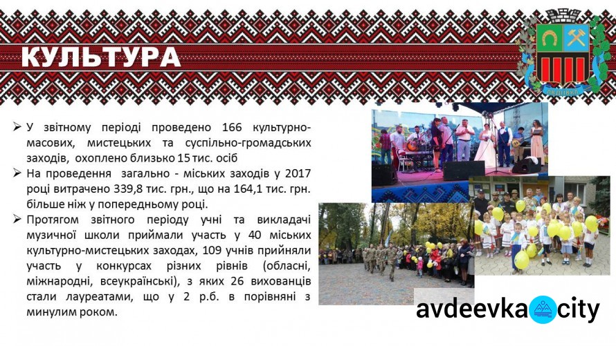 Информацию о работе объектов образования и культуры озвучила Людмила Меженина, заместитель руководителя ВГА по гуманитарным вопросам. Согласно озвученным данным, за минувший год в Авдеевке было проведено 166 культурно-массовых, художественных и общественных мероприятий, на которые из городского бюджета было выделено 339,8 тыс. грн., что на 164,1 тыс. грн. больше чем в 2016 году.