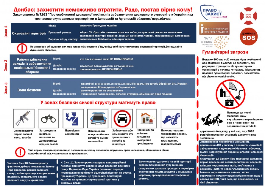 Представники Восток-SOS роблять такий висновок: «Нова редакція проекту Закону «Про особливості державної політики із забезпечення державного суверенітету України над тимчасово окупованими територіями в Донецькій та Луганській областях» (реєстр. № 7163), яка запропонована Комітетом ВР з національної безпеки і оборони до другого читання, суттєво відрізняється від тексту проекту закону, поданого Президентом України для першого читання. Відмінності між першим текстом та тим, що був напрацьований Комітетом, містяться у цілому ряді статей, які можуть значно погіршити безпекову та гуманітарну ситуацію та ситуацію з дотриманням прав людини не тільки в Донецькій та Луганській областях, але й по всій території України. Також слід зазначити, що райони «здійснення заходів із забезпечення національної безпеки і оборони, відсічі і стримування збройної агресії Російської Федерації», «райони бойових дій» та «зони безпеки», які передбачені новою редакцією Проекту, не мають чіткого визначення. Але при цьому саме у їхніх межах особи, що залучення до здійснення заходів із забезпечення національної безпеки, отримують безпрецедентні повноваження без належного та ефективного контролю. Крім того, законопроект не передбачає механізму врегулювання розбіжностей, що існують між нормами, запропонованим проектом закону та положеннями інших нормативних актів, що вже регламентують питання реалізації прав, наприклад, внутрішньо переміщених осіб або осіб, що мешкають на території Донецької та Луганської областей (наприклад, Розпорядження КМУ від 07.11.2014 № 1085-р, із яким пов’язана виплата щомісячної грошової адресної допомоги переселенцям, або Закон України «Про тимчасові заходи на період проведення АТО» тощо)».