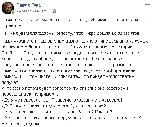 Издание «Новости Донбасса» поинтересовалось непосредственно у Георгия Туки, означает ли это, что МинВОТ будет инициировать отмену социальных выплат голосовавшим на «выборах Л-ДНР».
