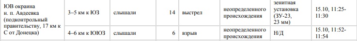 В таблице НРПО фигурирует и Авдеевка, у которой наблюдатели зафиксировали 14 выстрелов и шесть взрывов неопределенного происхождения.