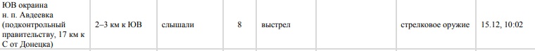 Утром 15 декабря, находясь на юго-восточной окраине города Авдеевка, наблюдатели слышали (в 2–3 км к ЮВ) 8 выстрелов из стрелкового оружия.