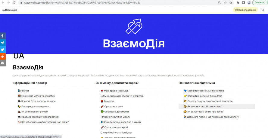 Саме на ВзаємоДії зібрані десятки корисних посилань по різних напрямах: пошук житла, психологічна та медична допомога, зібрані новини з усієї України та по різних регіонах. Дані на платформі регулярно обновлюється і завжди є актуальними.