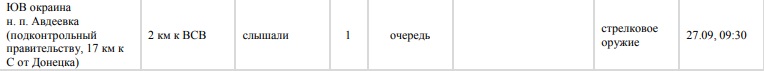 В сводке единственный раз упоминается Авдеевка: 27 сентября в 09:30 наблюдатели, находящиеся на юго-восточной окраине прифронтового города, слышали одну очередь из стрелкового оружия.