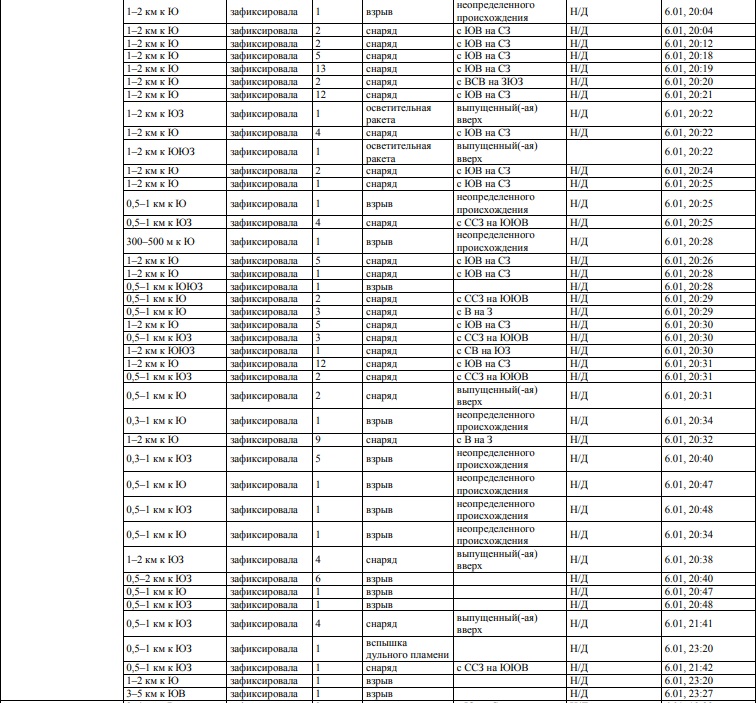 С вечера 5 по вечер 6 января СММ констатировала уменьшение количества НРПО, зафиксировав при этом больше взрывов (около 50), по сравнению с предыдущими сутками. Большинство НРПО вновь зафиксировано в районах к востоку от Светлодарска.