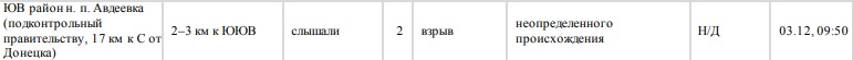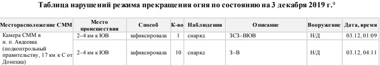 Согласно данным СММ ОБСЕ, ночью 3 декабря камера зафиксировала в районе Авдеевки пролеты снарядов. А утром тех же суток наблюдатели слышали в районе Авдеевки два взрыва неопределенного происхождения.