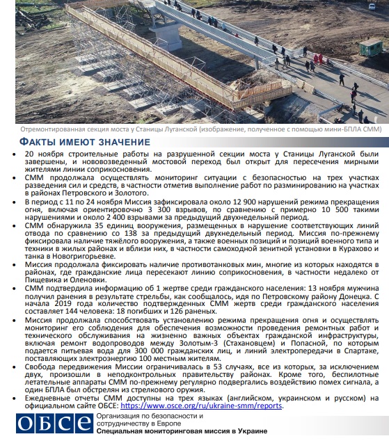 В период с 11 по 24 ноября Миссия зафиксировала около 12 900 нарушений режима прекращения огня, включая ориентировочно 3 300 взрывов, по сравнению с примерно 10 500 такими нарушениями и около 2 400 взрывами за предыдущий двухнедельный период.