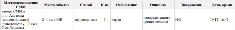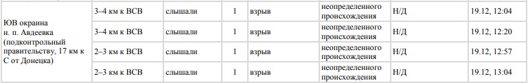 В последнем отчете СММ ОБСЕ (опубликован вечером 20 декабря) отмечается, что один взрыв в районе Авдеевки зафиксировала 19 декабря камера Миссии, а еще четыре слышали сами наблюдатели.