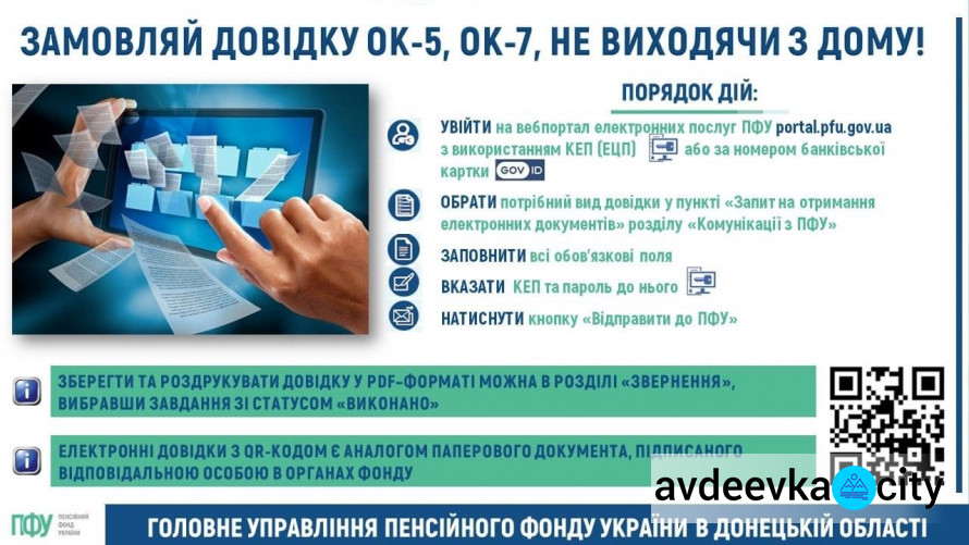 Авдіївцям можна отримати довідки про страховий стаж та багато інших документів, не виходячи із дому. Для цього потрібно скористатись сучасним сервісом надання електронних документів з підтвердженим QR-кодом під час онлайн-відвідування органів Пенсійного фонду України, повідомляє avdeevka.city.