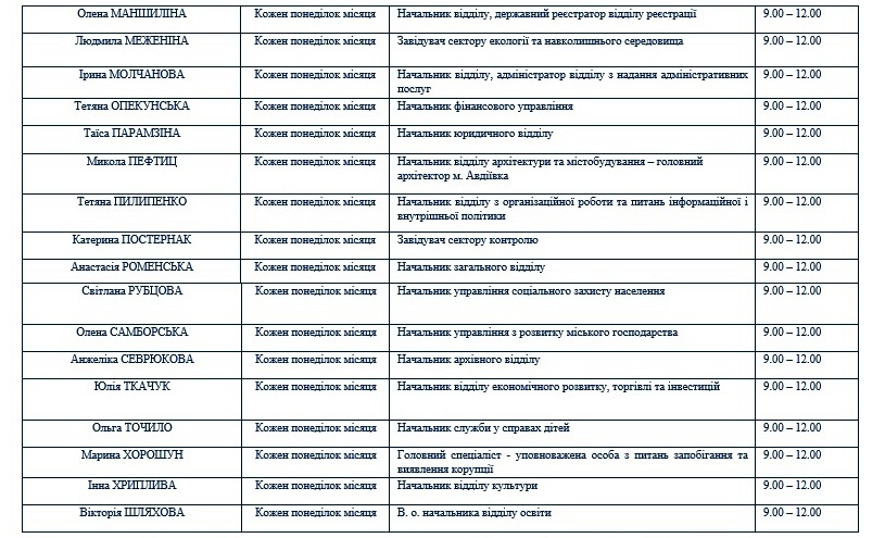 В Авдіївці затвердили графік проведення особистих прийомів громадян начальниками структурних підрозділів Авдіївської міської військово-цивільної адміністраці на 2022 рік, повідомляє avdeevka.city з посиланням на ВЦА.