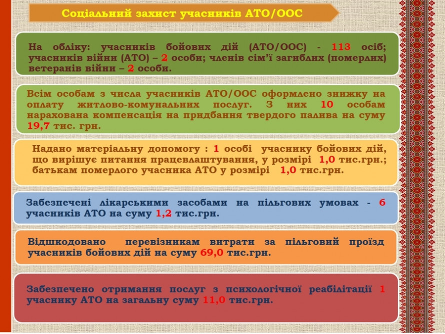 Всім особам з числа учасників АТО-ООС офомлено знижку на оплату житлово-комунальних послуг. З них 10 особам нарахована компенсація на придбання твердого палива на суму 19,7 тис. грн.