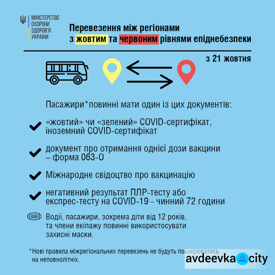 З 21 жовтня набувають чинності нові правила міжрегіональних перевезень на жовтому та червоному рівнях епіднебезпеки. Стосуватимуться вони регулярних та нерегулярних перевезень. Йдеться про автомобільний транспорт на автобусних маршрутах, авіаційний та залізничний транспорт міжобласного сполучення. Норми не будуть застосовуватись до міських та внутрішньообласних перевезень, повідомляє avdeevka.city з посиланням МОЗ.
