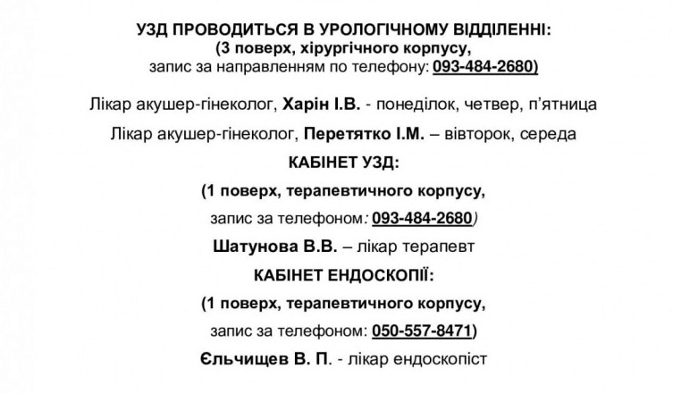 Лікарі проводять прийом у лікувально-діагностичному відділені - вул. Соборна, 20. Телефон для довідок: 063 507-54-95.