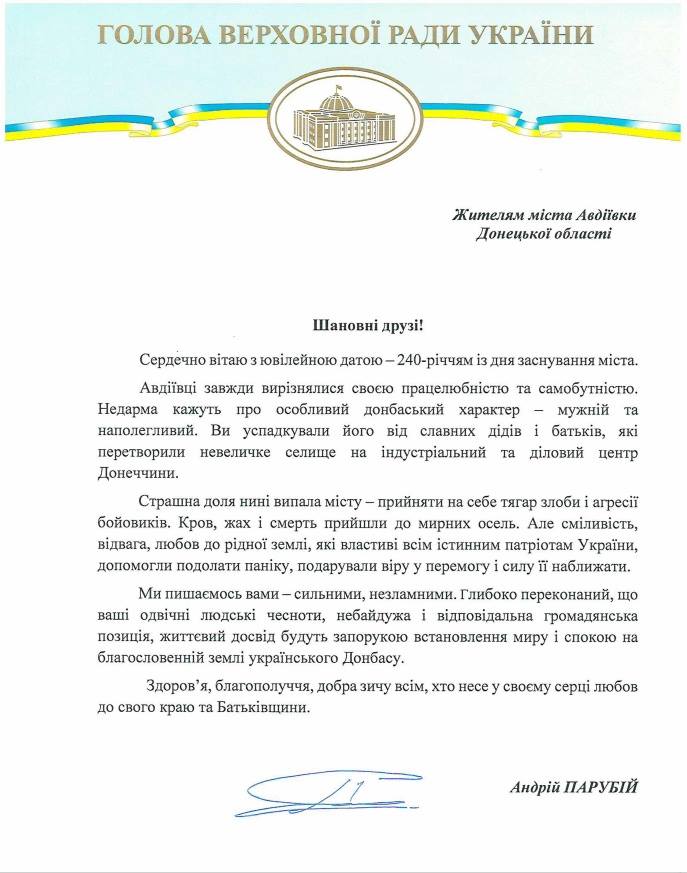Также военно-гражданская администрация Авдеевки опубликовала поздравление от спикера украинского парламента Андрея Парубия.