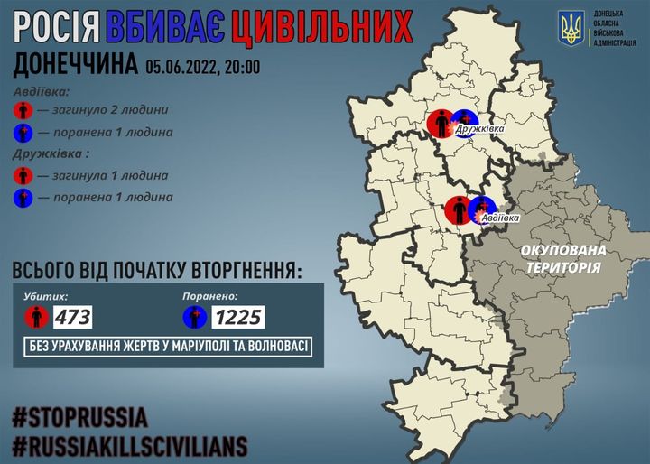 За 05 червня росіяни вбили трьох мирних жителів Донеччини: двох чоловіків в Авдіївці та одного у Дружківці. Ще двоє людей в області дістали поранення. Про це повідомив начальник Донецької ОВА Павло Кириленко.