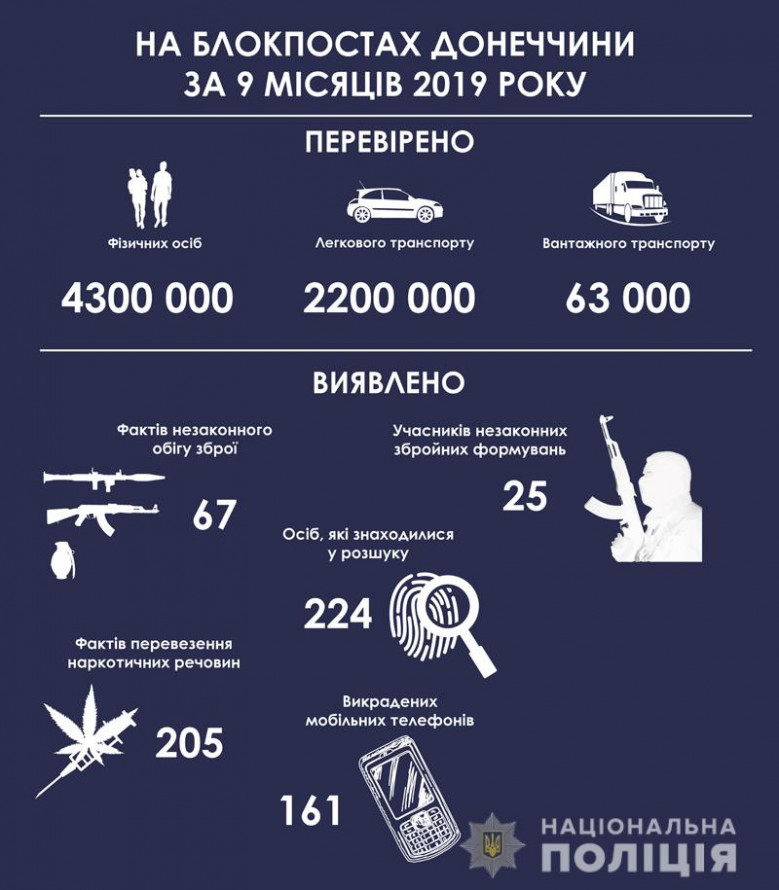 За 9 месяцев 2019 через блокпосты Донетчине, где дежурят представители полиции, прошли более 63 тысяч единиц грузового транспорта, свыше 2,2 млн. легковых авто и более 4,3 млн. граждан.