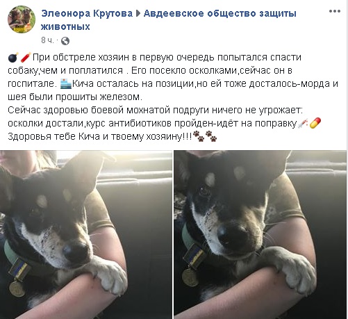 «При обстреле хозяин в первую очередь попытался спасти собаку, за что и поплатился . Его посекло осколками, сейчас он в госпитале, - пишут защитники животных из Авдеевки. - Кича осталась на позиции, но ей тоже досталось - морда и шея были прошиты железом. Сейчас здоровью боевой мохнатой подруги ничего не угрожает: осколки достали, курс антибиотиков пройден - идёт на поправку».