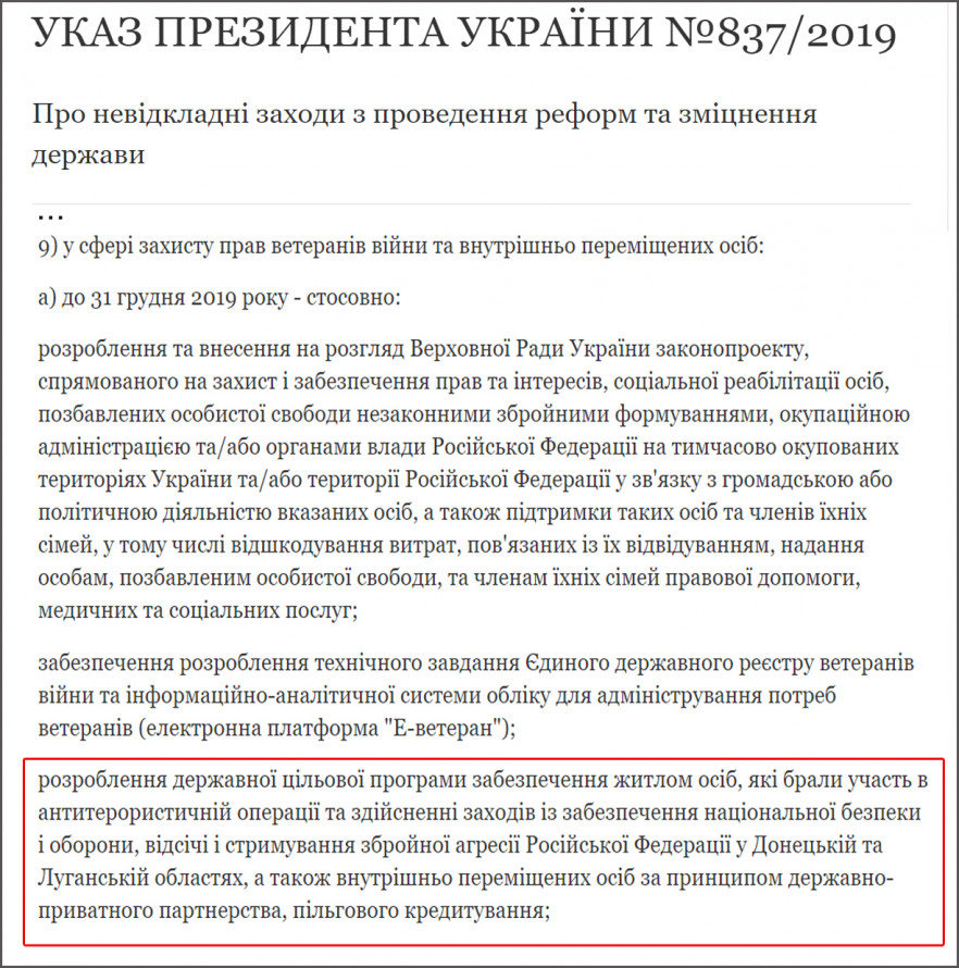 8 ноября президент Украины Владимир Зеленский подписал Указ № 837 «О неотложных мерах по проведению реформ и укрепления государства». Пункт 9 данного документа посвящен мероприятиям по защите прав ветеранов войны и внутренне перемещенных лиц, напоминает dnews.dn.ua