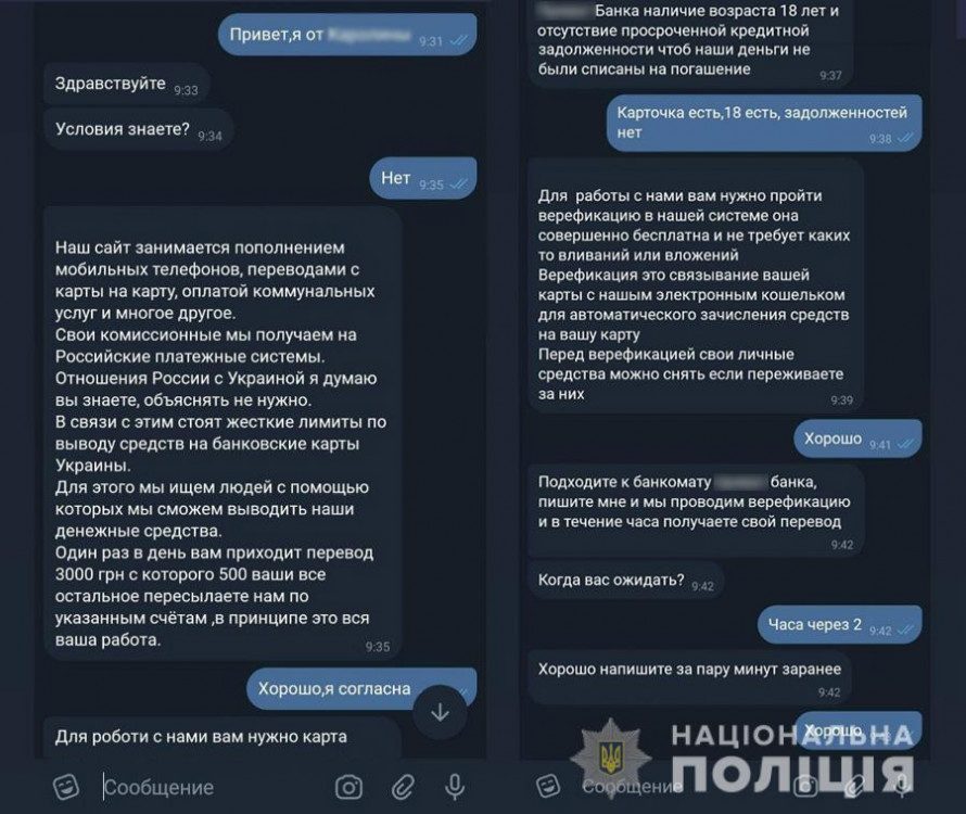 «Компания» якобы подыскивает лиц, которые могут выступить посредниками: получать деньги на свою карточку и пересылать их на другие счета. За это добровольцам выплачивать по 500 гривен в день. А чтобы стать работником, нужно пройти «бесплатную верификацию» (на самом деле - предоставить персональные данные и банковские реквизиты и «привязать» свой счет к чужому телефону).