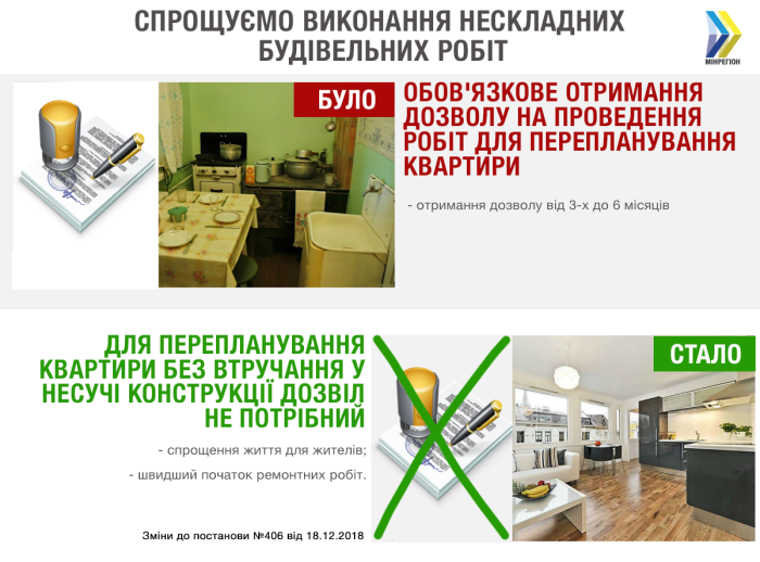 "В прошлом году Минрегион разработал перечень несложных строительных работ, которые могут выполняться без получения разрешения на проведение работ и не требуют ввода в эксплуатацию. Это значительно упростило возможность устраивать, например, пандусы и другие средства доступности или заменять блоки балконов, окон, дверей. В этом году мы инициировали расширение этого перечня. В частности, если раньше для перепланировки квартиры обязательно нужно было получать разрешение Госархстройинспекции (ГАСИ), то теперь такие работы, если нет вмешательства в несущие конструкции, не требуют этих документов ", - сообщил замминистра регионального развития, строительства и ЖКХ Украины Лев Парцхаладзе.