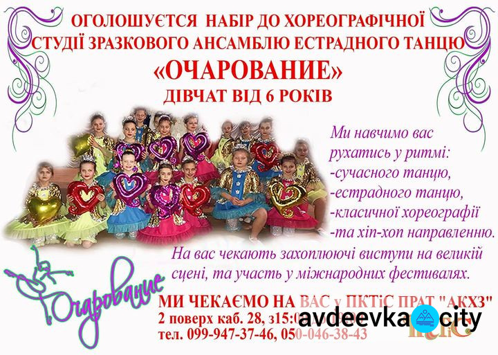 Хореографічна студія зразкового ансамблю бального танцю "Очарование" оголує набір дівчаток від 6 років, які бажають навчитися гарно танцювати, повідомляє avdeevka.city.